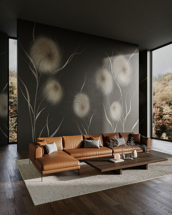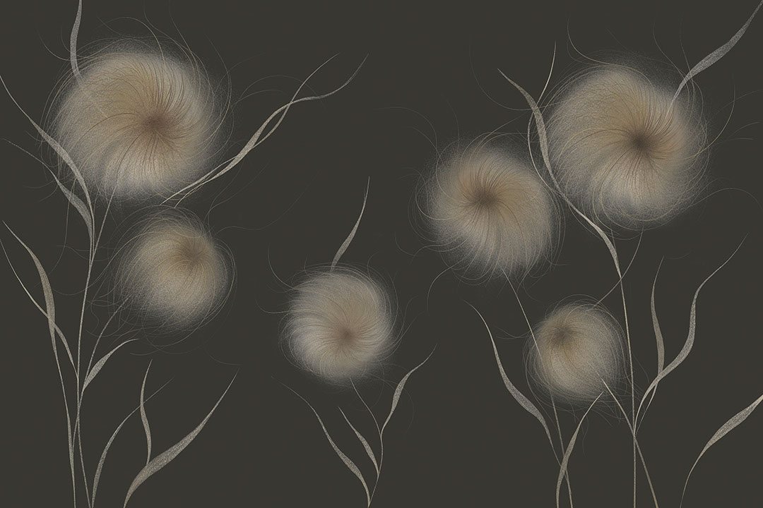 Das Designer-Wandbild Nightplume verleiht jedem Raum Galeriecharakter. Leuchtende, federleichte Samenbüschel in Champagner- und Taupetönen schweben vor tiefschwarzem Grund wie Funken in der Nacht. Eine dezente Leinenstruktur in Anthrazit sorgt für Tiefe, ohne vom Motiv abzulenken. Die starke Kontrastpalette passt hervorragend zu dramatisch-modernen, Art-Déco- oder luxuriös-minimalistischen Interieurs und harmoniert mit Messing, Samt und dunklem Holz. Platzieren Sie es hinter dem Sofa für sofortige Dramatik, gestalten Sie eine ausdrucksvolle Kopfteilwand oder veredeln Sie einen Boutique-Eingang. Zarte organische Formen mildern den kräftigen Hintergrund und schaffen eindrucksvolle Leichtigkeit.