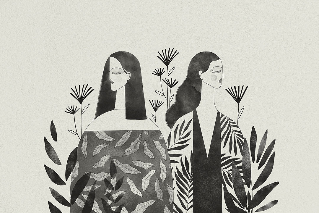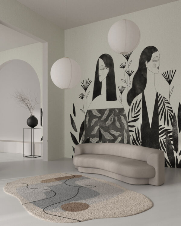 Im Mittelpunkt des Wandbildes Sisterhood stehen zwei stilisierte Frauenfiguren. Ihre Silhouetten sind mit schwarz-weißen Blättern und Palmen in Aquarelloptik gefüllt und erinnern an einen inneren Garten. Feine Linien zeichnen sanft geschlossene Augen, die strukturierte Papierfläche bringt Wärme. Die neutrale Farbwelt passt zu hellen Sofas, Eichenholz und Messingakzenten. Über einer Konsole wirkt das Motiv wie Galerie-Kunst, im Ankleideraum setzt es einen modischen Akzent, in einem Café verleiht es leise Raffinesse.