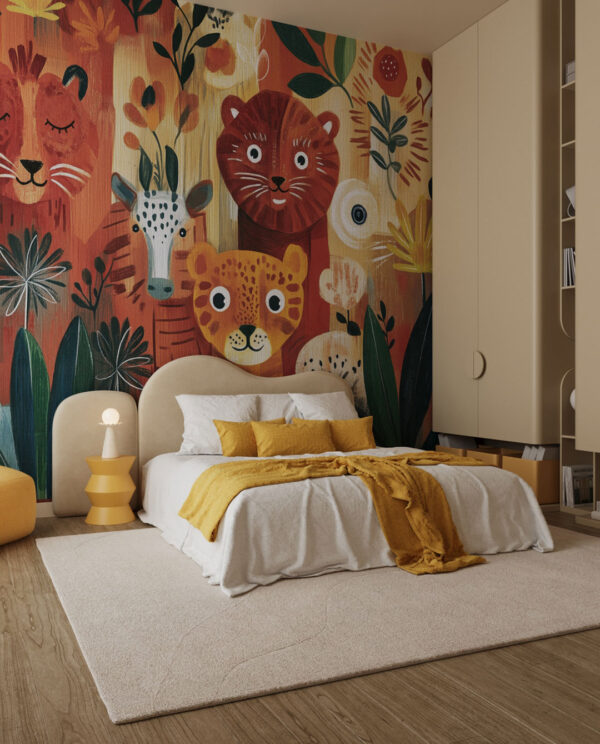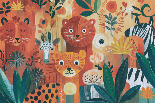 Das Wandbild Jamboree macht aus einer Wand eine Safari-Geschichte. Breite Pinselstriche legen einen Sonnenuntergang aus Koralle, Ocker, Dschungelgrün und Türkis an, dann tauchen freundliche Tiere auf: ein träger Löwe, eine gepunktete Giraffe, ein neugieriger Leopard und eine Zebra-Schnauze am Rand. Stilisiertes Blattwerk schließt die Lücken, sodass Kinder immer wieder neue Formen entdecken können. Die matte, gemalte Oberfläche verzeiht Fingerabdrücke und passt zu Rattanbettchen genauso wie zu modernem Spielzeug-Regal. Setzen Sie Jamboree im Kinderzimmer für Rollenspiele ein, schaffen Sie eine fröhliche Leseecke im Kindergarten oder bringen Sie Farbe hinter den Basteltisch.