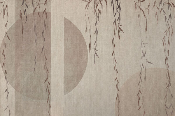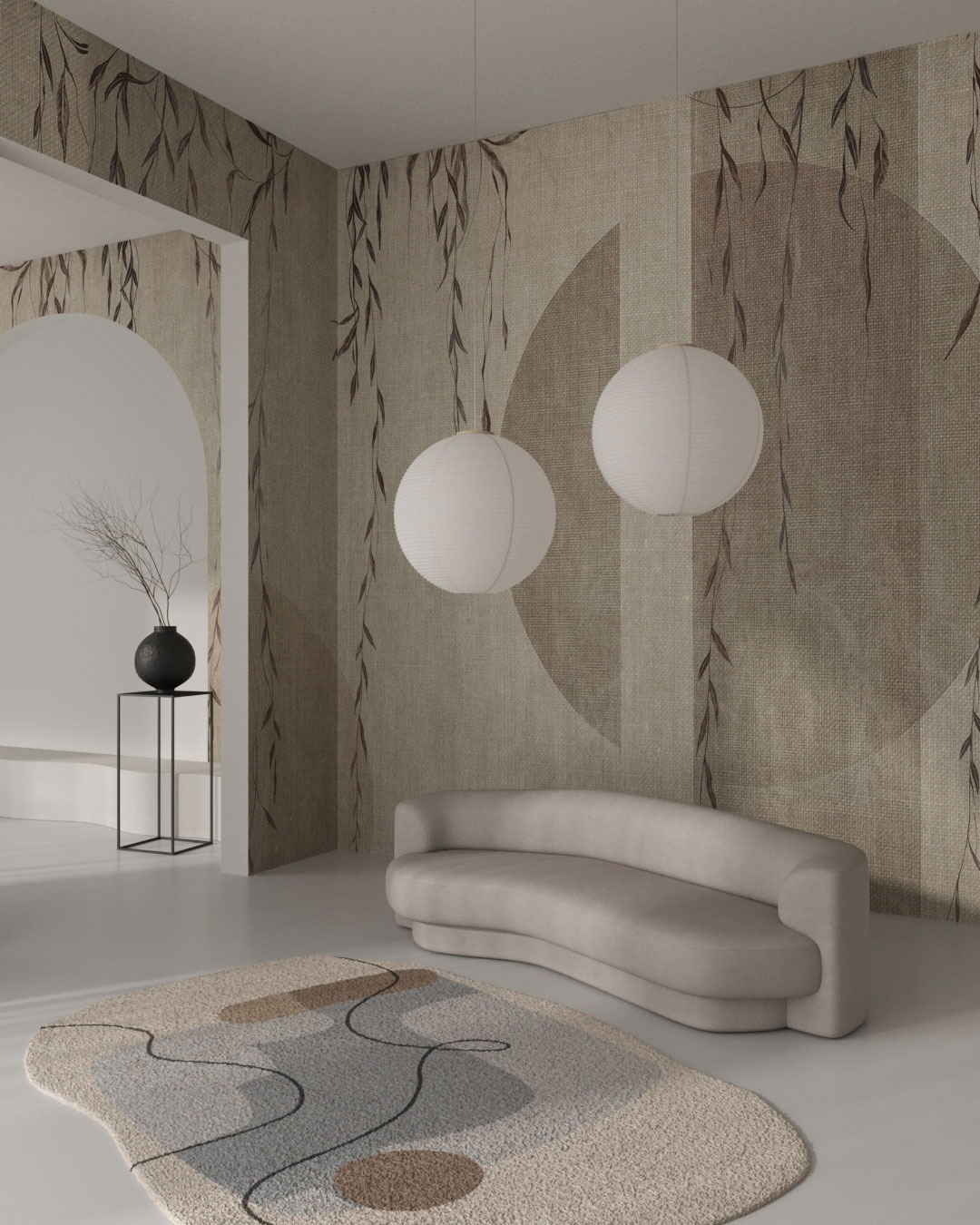 Willoway legt fallende Weidenranken über ein ruhiges Feld geometrischer Formen, als wäre ein Siebdruck auf rohes Leinen gepresst. Halbkreise in gedämpftem Lehm und Taupe schweben wie Monde hinter feinen Zweigen, die sich zu Spitzen verjüngen. Die sichtbare Leinenstruktur verleiht dem Bild handgewebte Gelassenheit. Kombinieren Sie Willowaymit einer Konsole aus hellem Eichenholz, Steinzeug-Leuchten und einer Bouclé-Bank für Spa-Ruhe, oder setzen Sie mit mattschwarzen Wandleuchten und einem Rauchglas-Tisch japandihaften Minimalismus. Hinter dem Bett wirkt es wie ein sanftes Kopfteil, im Flur mildert es harte Kanten, im offenen Wohnraum zoniert es eine Leseecke ohne Wände.