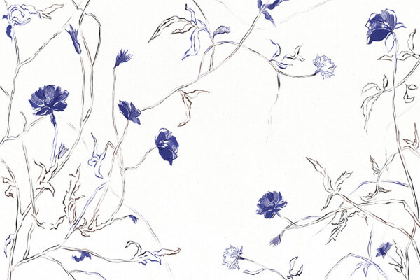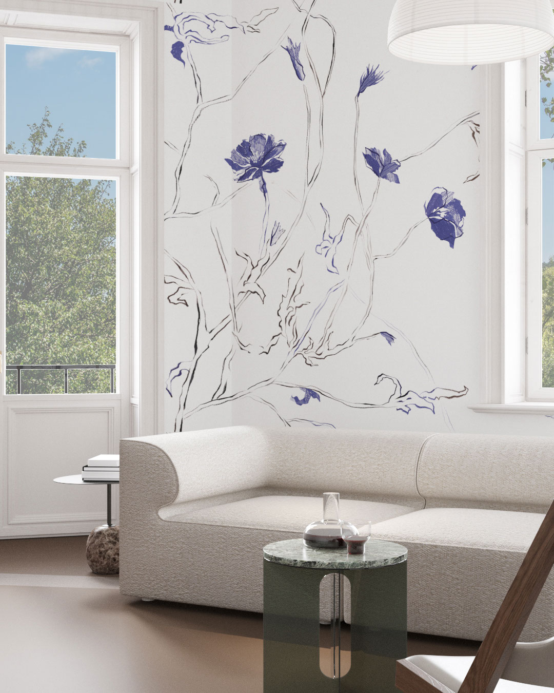 Cerulean destilliert eine Sommerwiese auf Tusche, Linie und Luft. Fein gezeichnete Stängel schlängeln sich über elfenbeinfarbenen Grund, indigoblaue Blüten füllen sich mit lockerem Pinsel, der von Kobaltblau zu Mitternachtston ausläuft. Sepiabraune Akzente wärmen die Palette wie sonnengetrocknete Blätter. Der großzügige Leerraum in der Mitte lässt Möbel wirken, ohne das Motiv zu überladen. Kombinieren Sie Cerulean mit hellem Eichenholz, Leinensesseln und patinierter Messingbeleuchtung für ländliche Eleganz oder setzen Sie matte Schwarzakzente und eine gerillte Travertin-Konsole für Galerie-Minimalismus. Perfekt hinter einem Lesesessel, entlang einer lichten Treppe oder an einer Küchenbank, wo Gespräche fließen.