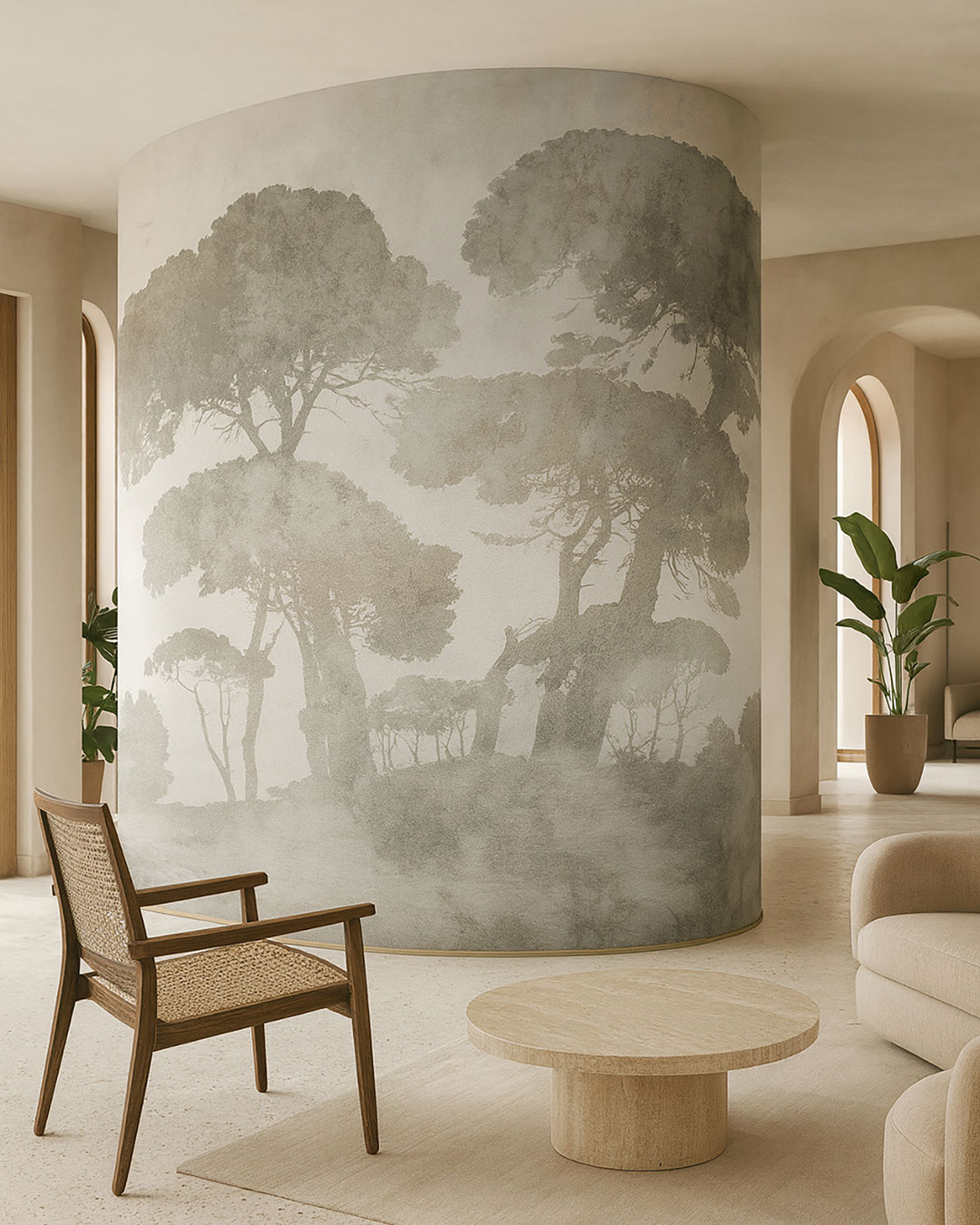 Aeris schafft eine meditative Ruhe mit Kiefern, die sanft in einem grauen Nebel verschwimmen. Die kühle Farbpalette verleiht dem Raum Tiefe und Luftigkeit, ohne ihn mit Details zu überfrachten. Diese Fototapete eignet sich ideal für moderne Schlafzimmer, konzentrierte Arbeitsbereiche oder minimalistische Wohnzimmer. Aeris harmoniert besonders gut mit Glaselementen, hellen Holzmöbeln und Leinenstoffen. Sie hilft, eine ruhige, zeitgenössische Umgebung zu gestalten.