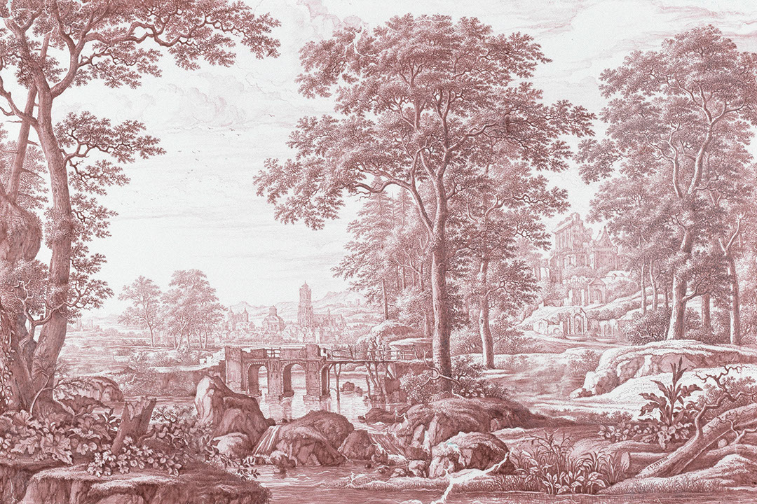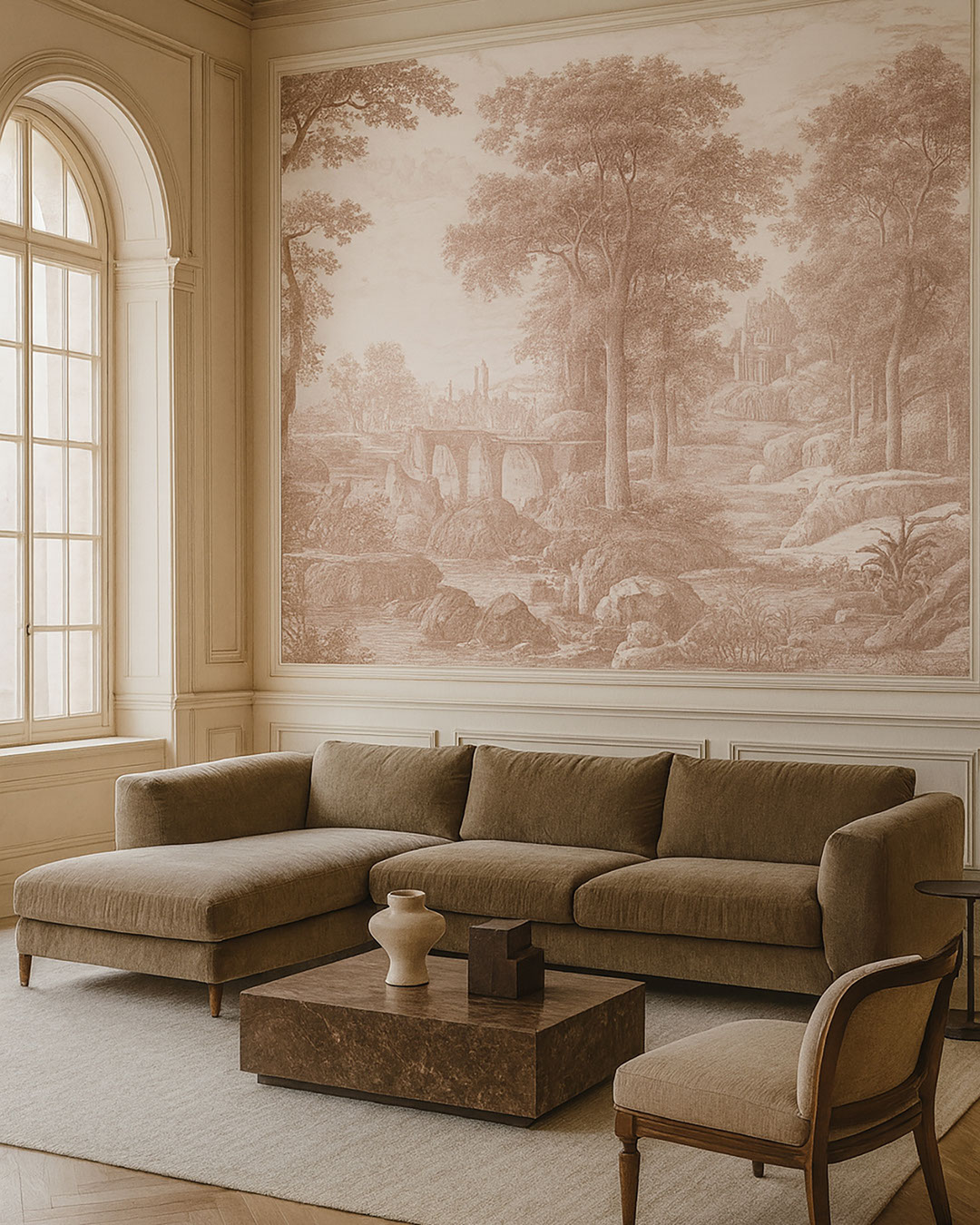 Rosaria erinnert an den Charme einer historischen Radierung mit Brücke, Fluss und ferner Stadt in sanften Rosé-Sepiatönen. Fein gezeichnete Bäume und Architektur bringen ein Gefühl von Geschichte und leiser Romantik in den Raum. Diese Fototapete eignet sich besonders für Wohnzimmer, Essbereiche oder Bibliotheken, in denen eine klassische, elegante Stimmung gewünscht ist. Rosaria harmoniert mit Möbeln aus dunklem oder honigfarbenem Holz, Leinenstoffen und Akzenten in Creme oder Altrosa. In Kombination mit warmem, indirektem Licht entsteht eine einladende, nachdenkliche Atmosphäre. Sie ist eine stilvolle Wahl für neoklassische, französisch inspirierte oder eklektische Vintage-Einrichtungen.