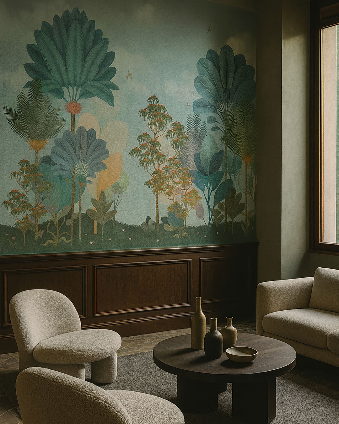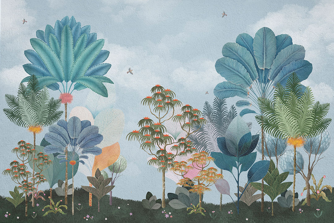 Celestia zeigt einen fantasievollen Garten, in dem stilisierte Palmen und Bäume in Türkis-, Blau- und Warmtönen in einen hellen Himmel ragen. Weiche Wolken und kleine Vögel verleihen der Komposition Leichtigkeit und Fröhlichkeit. Diese Fototapete eignet sich besonders für Kinderzimmer, Spielbereiche, Kreativstudios oder entspannte Familienwohnzimmer. Celestia harmoniert schön mit weißen oder hellgrauen Wänden, hellem Holz und Textilien in Mint-, Korallen- und zarten Lavendeltönen. In Kombination mit schlichten Möbeln und abgerundeten Dekoelementen entsteht eine freundliche, traumhafte Umgebung. Das Design regt die Fantasie an und lädt zum Spielen ein, bleibt dabei aber sanft genug für den Alltag.
