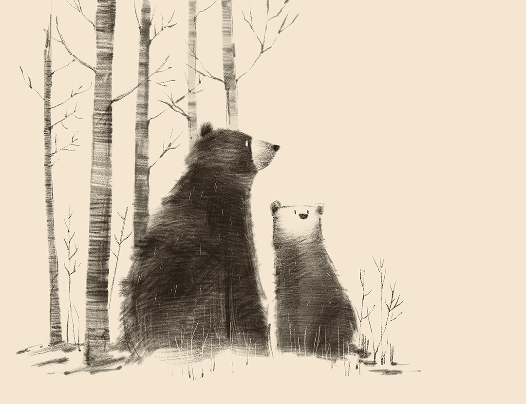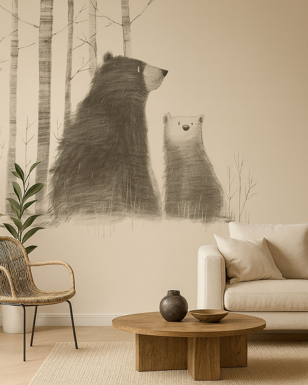 Ursina zeigt einen großen und einen kleinen Bären, die ruhig zwischen schlanken Birken sitzen und eine warme Geschichte von Fürsorge und Vertrauen erzählen. Die weiche monochrome Zeichnung wirkt wie eine feine Bleistiftskizze und bringt Geborgenheit und Wärme in den Raum. Der zurückhaltende helle Hintergrund lässt das Zimmer luftig wirken und passt zu vielen Einrichtungsstilen. Diese Fototapete eignet sich hervorragend für Kinderzimmer, Babyzimmer, familiäre Leseecken oder ruhige Loungebereiche. Zusammen mit Holzmöbeln, Textilien in Naturtönen und waldinspirierten Accessoires schafft Ursina einen zarten Ort für Spiel, Ruhe und abendliche Geschichten.